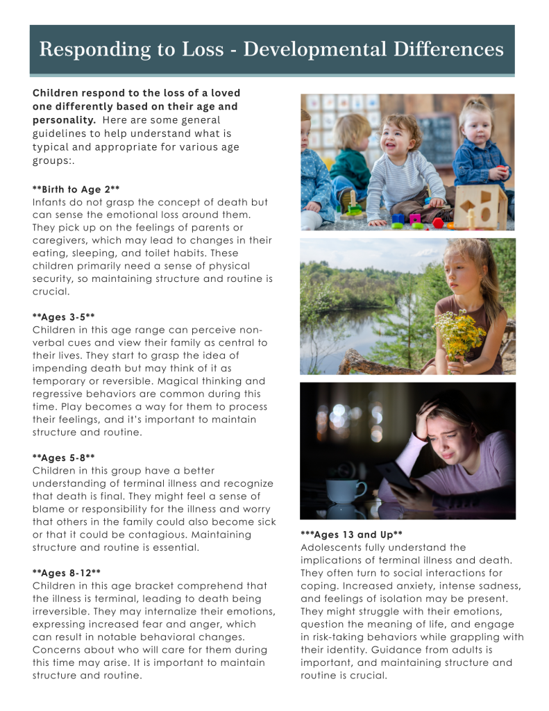 Everyone grieves differently, and there is no “best” way to grieve, just as there is not a timeline. A child’s developmental stage, temperament, and relationship with the person they are missing are factors in how the loss is felt and expressed. It is a very individual process and differs from child to child, or situation to situation.