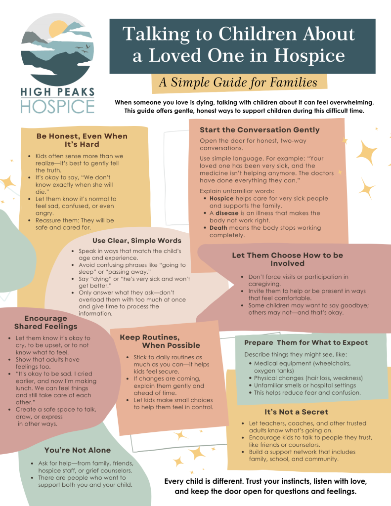 Be patient with the child and with yourself. Moving through grief is a process, and you may also be grieving. Children may ask the same questions repeatedly. It is best to answer honestly, giving age-appropriate information.